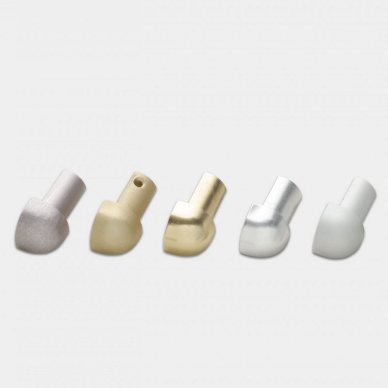 Accesorio premium de aluminio para esquinas que se utiliza junto al Guardacanto Bullnose. Protege la unión de los revestimientos en su punto más débil y logra extremos con diseño perfectamente redondeados. Para encuentro de dos planos internos utilice Esquinero Espiga Interno.