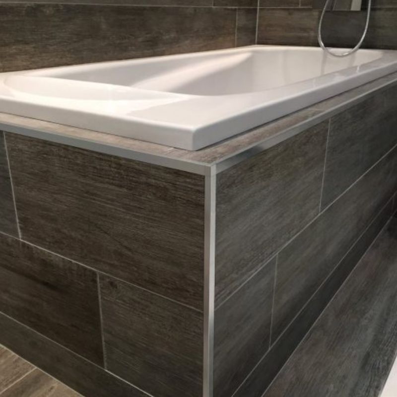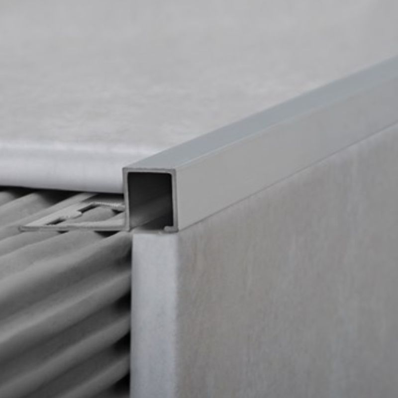 Perfil de vista cuadrada que acompaña griferías y diseños rectos. Protege la unión de los revestimientos logrando un diseño moderno. Se utiliza en porcelanatos rectificados o como listello decorativo.