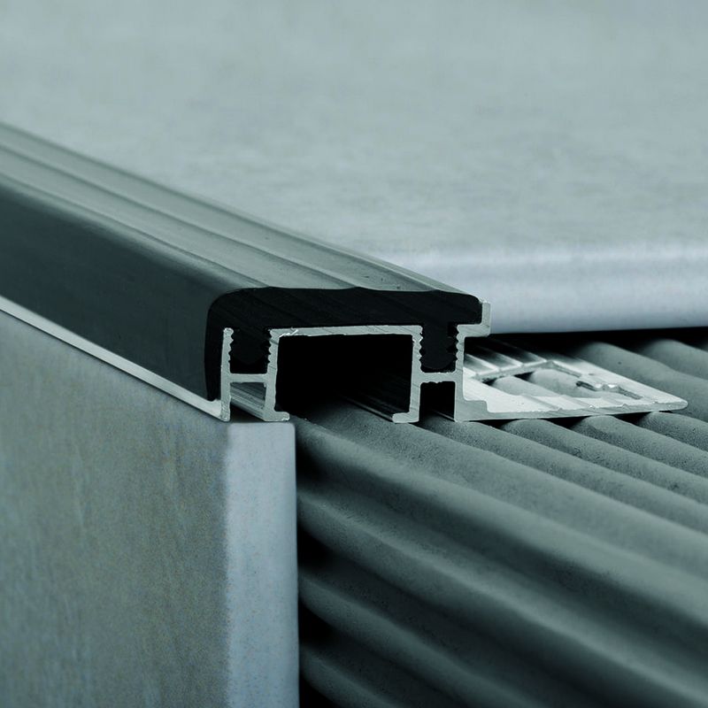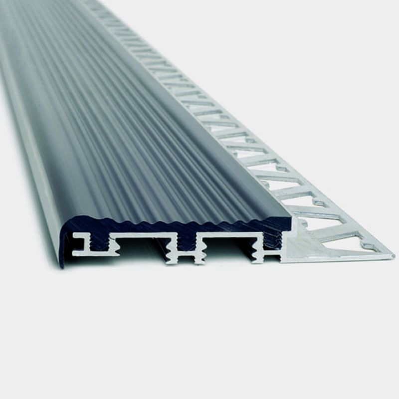 Perfil de aluminio de alta resistencia que cuenta con una tira de PVC antideslizante re-cambiable que garantiza seguridad y terminación al peldaño. Recomendada para áreas de alto tránsito.