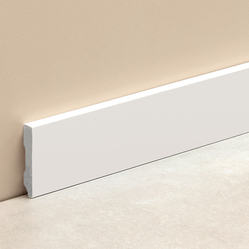 De color blanco mate y 50 mm de altura, de diseño plano y líneas rectas, es una opción pequeña de terminación.